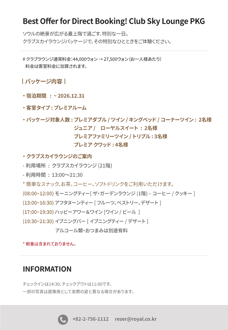 Best Offer for Direct Booking! Club Sky Lounge Pkg 최고관리자 2025-09-01 최고관리자 0 1501 2025.09.01 10:17 Reservation