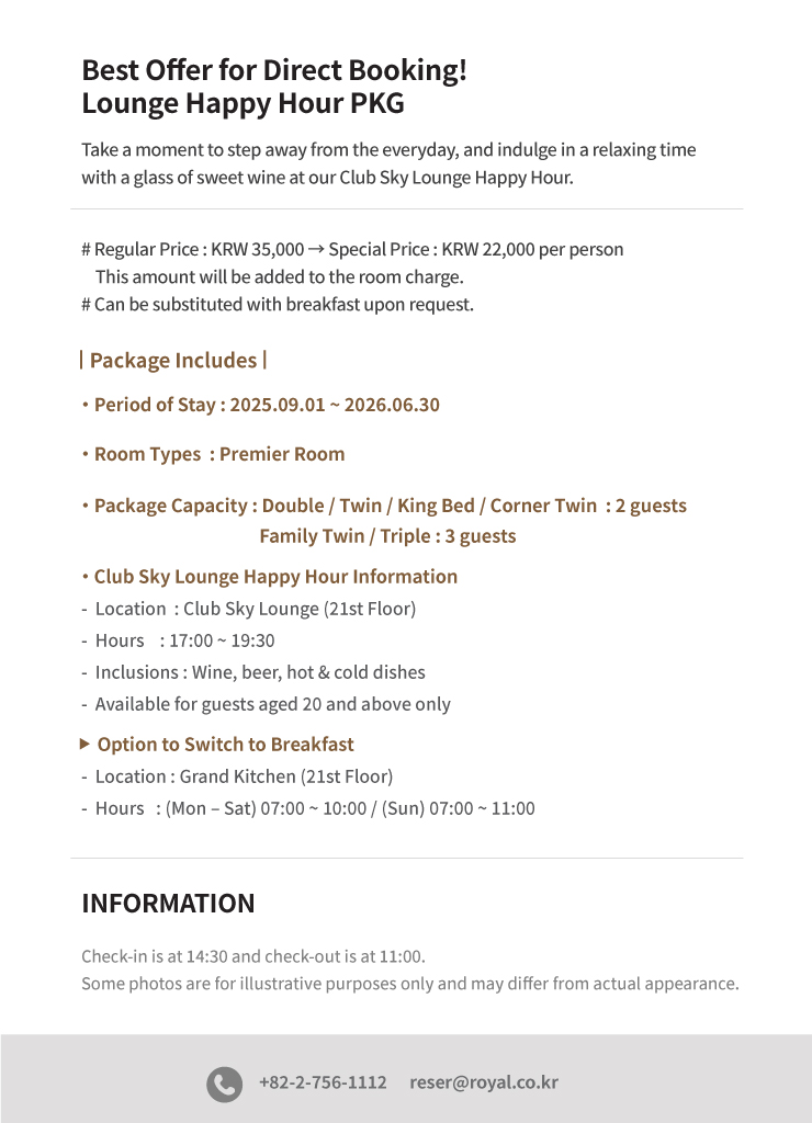 Best Offer for Direct Booking! Lounge Happy Hour Pkg 최고관리자 2025-09-01 최고관리자 0 786 09.01 10:14 Reservation