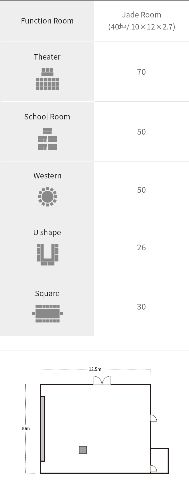クールな落ち着いた色が特徴の ジェイドルームは50~100人収容が可能で、 会議や セミナーなどのイベントを開催することができます。