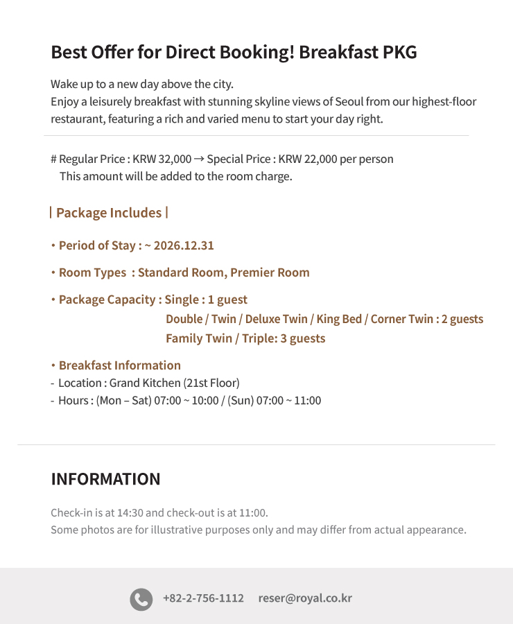 Best Offer for Direct Booking! Breakfast PKG 최고관리자 2025-09-01 최고관리자 0 1435 2025.09.01 10:13 Reservation